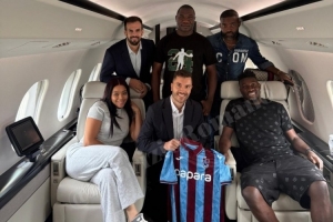 奥纳纳与家人、经纪人在飞机上合影,展示特拉布宗体育球衣